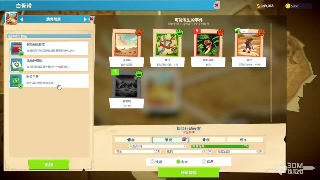 配置界面可以选择随身物品,不同的物品拥有不一样的能力,一般情况下可以选择医疗包,可以移除一个受伤事件,在探险的过程中,专家有可能会遇见各种事故,可能会受伤,也有可能直接死亡,所以如果专家等级很高很难再培养一个的话就比较推荐使用医疗包。