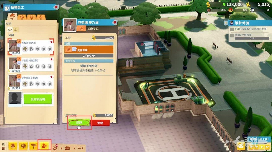 之后需要招募合适数量的员工从勤杂工、专家、助理、保安都在这一区域,成功招募好之后可以直接拖拽放置到博物馆。点击员工可以查看员工的薪资满意度忠诚度等等。也可以管理员工选择是否解雇等等。