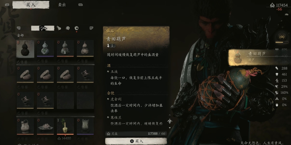 青田葫芦能回复法力和元气,还能无限续杯,获取方式是解锁全部的影神图鉴,其中大圣残躯需要玩家进入二周目才能解锁,袁守城是解锁其它图鉴后自动解锁,解锁图鉴后再去找卖酒的申猴就能看到青田葫芦。虽然一口就能喝完,但只要等两套连招的时间就会自动回复,使用琼浆时和龟泪能回复更多法力值,如果走的是法术流,就能用青田葫芦加琼浆和龟泪来频繁释放法术,不过瞌睡虫会有机动惩罚,一定要谨慎使用。