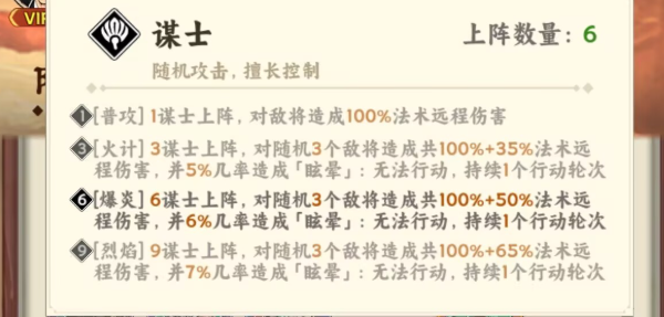 机制层面,谋士普通攻击附带100%法术远程伤害;当上阵3名谋士时,可对随机三名敌方单位造成135%法术伤害,并有5%概率触发眩晕;增至6名时,伤害提升至150%,眩晕概率同步增至6%;若达成9人烈焰羁绊,则法术伤害达165%,眩晕概率升至7%。该机制确保了输出强度与控场频率的双重成长,形成可持续压制节奏。