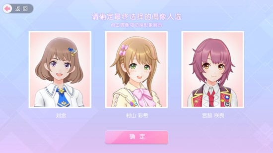 你作为经纪人可以自由选择初始的三位偶像哦。小编是一个路外,全凭二次元颜值选择,选了刘念、村山彩希和宫脇咲良。