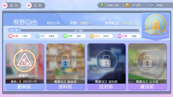 除了新颖的偶像养成玩法,《AKB48樱桃湾之夏》还加入了公司经营的内容,玩家不但是一位偶像经纪人,还要全方位的掌握娱乐公司的各个方面,在樱桃湾的公司建设服装部、资料部、应对部、建设部等。小编因为是初体验,暂时建设了服装部,在服装部,我可以作为经纪人为偶像们定制公演服、休闲服、限定服等服装。