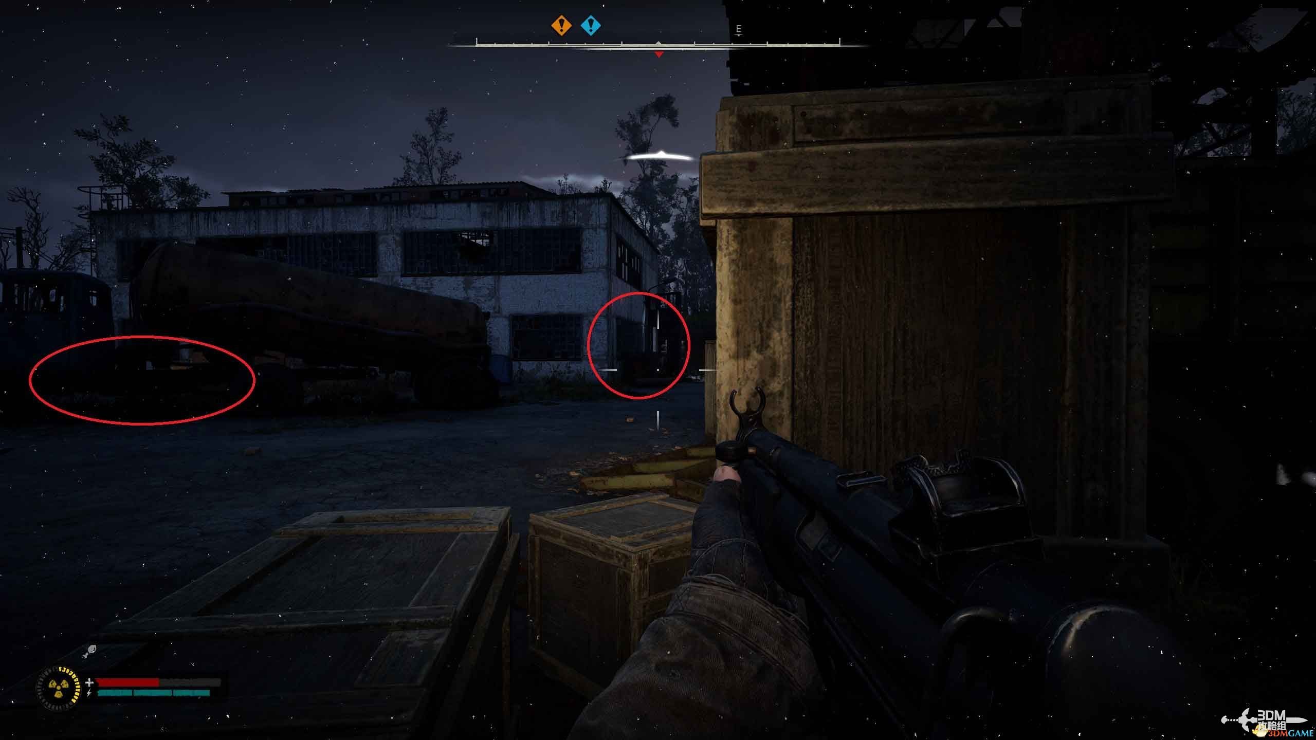 进入标记点后就是一个营房,可以一拖角落的杂物箱、汽车躲避。