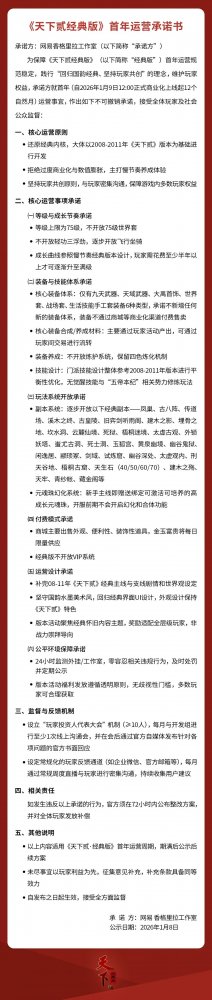 为此,项目组正式公示了《天下贰经典版首年运营承诺书》。这份承诺从经典玩法内核、慢节奏养成模式,到玩家共创监督机制与公平环境保障,均作出了不可撤销的郑重承诺,并接受全体玩家的监督和见证。