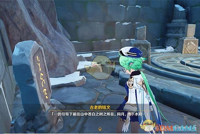 这块石碑位于“三只匣子”开启的密室内,石碑上的铭文内容:“……的引导下前往山中苍白之树之所在。同月,地下水路……”