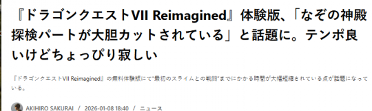 经典名作《勇者斗恶龙7:重制版》昨天开启试玩,已经有玩家参与试玩发布反馈,普遍反应原版让玩家不适的拖沓部分已经得到了改善。