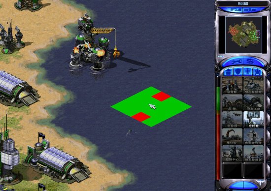 如下图,利用造船一旦碰到障碍物就没法建造原理,图上的两红点就是海豚,这样就可以在第一时间内发现这些隐形的海军单位,只需用绿框晃晃就知道它们的位置所在,那然后想办法对付就容易的多了。