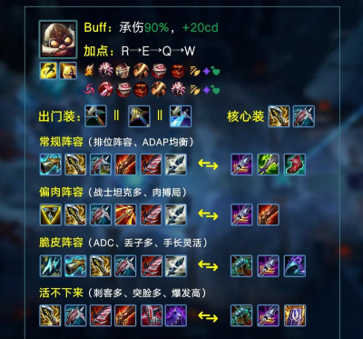 在天赋中,我们还是选择点出狂怒,毕竟作为ADC,初始攻速肯定是不够用的,符文中没有带攻速的话,天赋一定要点出来弥补。盛宴可以通过补刀进行回血。EZ技能手长,何况还有E技能跟闪现,因此抗压能力是很强的。所以点出盛宴可以赖线。吸血习性跟恃强凌弱我要放在一起讲。EZ我试过很多种出装,最终还是认为蓝EZ的作用更加大。在有冰拳的情况下,可以减速敌方配合恃强凌弱多打出2.5%的额外伤害,吸血习性则可以让EZ在不断的风筝当中进行一点点的回复,保证自己的生命安全。粉碎重击带来的破甲可以提升EZ的输出,在后期打起肉来更快。最后是战争热诚,有人就会问了,EZ不是技能型ADC吗?为什么不带冥火。那是因为在对线期,EZ是靠技能打伤害的,因为EZ对线期平A伤害远远不足德莱文,VN这种技能的伤害附加在平A中的英雄。但是到了后期,光靠技能输出显然还是不够的,ADC要做的就是A人,打输出。所以带热诚还可以增加平A的输出。