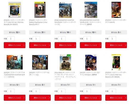 与此形成鲜明对比的是,前代作品《怪物猎人:世界+冰原》(PS4版)与《怪物猎人:崛起+曙光》(Switch版)在该店的回收价分别为494日元(约合人民币22.14元)和500日元(约合人民币22.41元)。《怪物猎人:荒野》的回收价已接近PSP平台的《怪物猎人:便携版》和3DS平台的《怪物猎人:世代》等便携式旧作的价位。