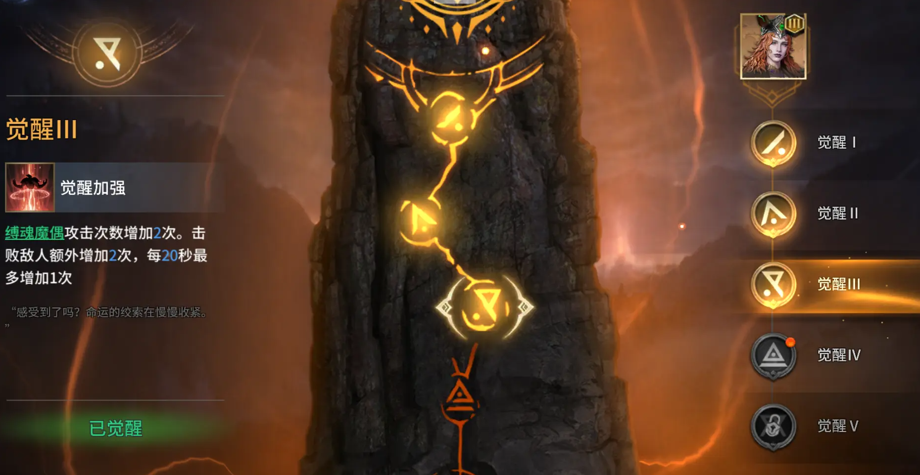 召唤3个缚魂魔偶,缚魂魔偶会自动索敌,每个召唤物可攻击15次、每次60%伤害,可以在短时间内打出高额群体伤害。如果周围没有敌人,缚魂魔偶会支援场上其他召唤物,可以跟着碧翠丝召唤物满地图跑。在攻击15次后会缚魂魔偶虚弱会移动到埃萨雷斯位置,埃萨雷斯开吞世者直接开吃,就能持续输出。