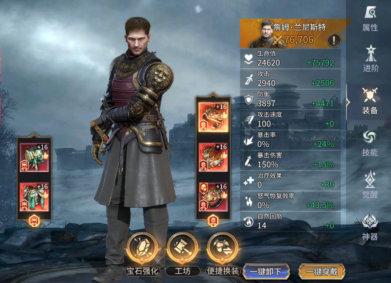 天赋:可给攻击范围内2名攻击最高的友方附加10%减伤,有用、意义不大,真缺减伤还是要带减伤奶。天赋可给友方添加凯岩城之荫,友方受伤时詹姆有额外回怒,在深渊龙、泰坦这类BOSS场合能多频触发。