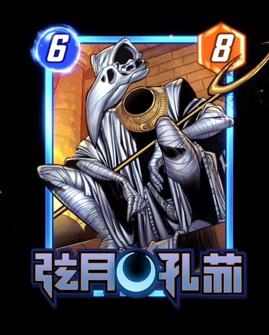 弦月孔苏[6/8] 被丢弃后,此牌返回手牌并进入下一个月相。揭示:将1张被你丢弃的卡牌复活至另一区域,并将其战力设为9。
