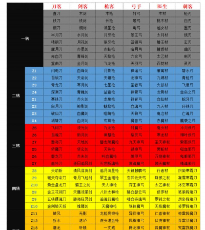 Z0:重曲刀、飞龙枪、青锋剑、百花杖、天羽弓