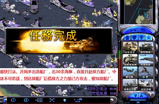 最快打法:开局多造船厂,出30余海豚,直接开赴敌方船厂,中途不要恋战,到达敌船厂后借敌方之力加己方攻击摧毁日军船坞。
