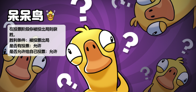 5、呆呆鸟:目标是被投票出局,你需要故意表现得像个鸭子(例如单独行动、在尸体旁徘徊等),让好人误判并将你票出,切忌被鸭子刀掉。