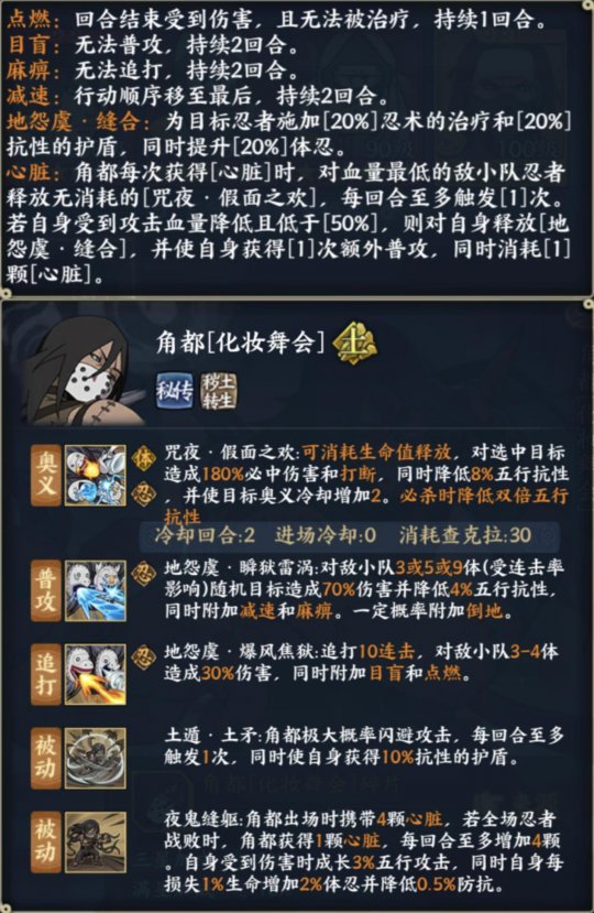 被动Ⅱ:夜鬼缝躯:角都出场时携带4颗心脏,若全场忍者战败时,角都获得1颗心脏,每回合至多增加4颗。自身受到伤害时成长3%五行攻击,同时自身每损失1%生命增加2%体忍并降低0.5%防抗。