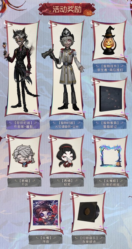 10月23日维护后,主题活动开启,参与即可赢取【奇珍时装】作曲家-暮影、【独特时装】火灾调查员-尘光、【独特挂件】求生者-南瓜提灯、头像、头像框、家具和表情等奖励。
