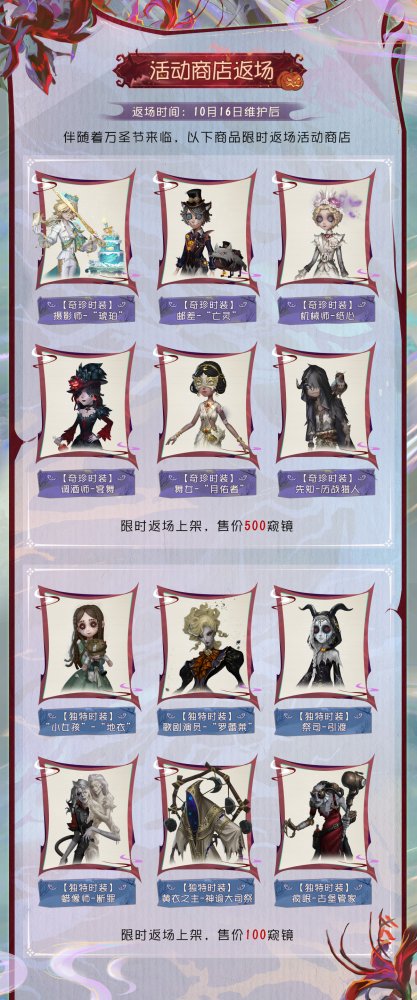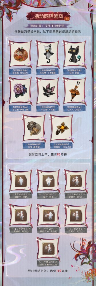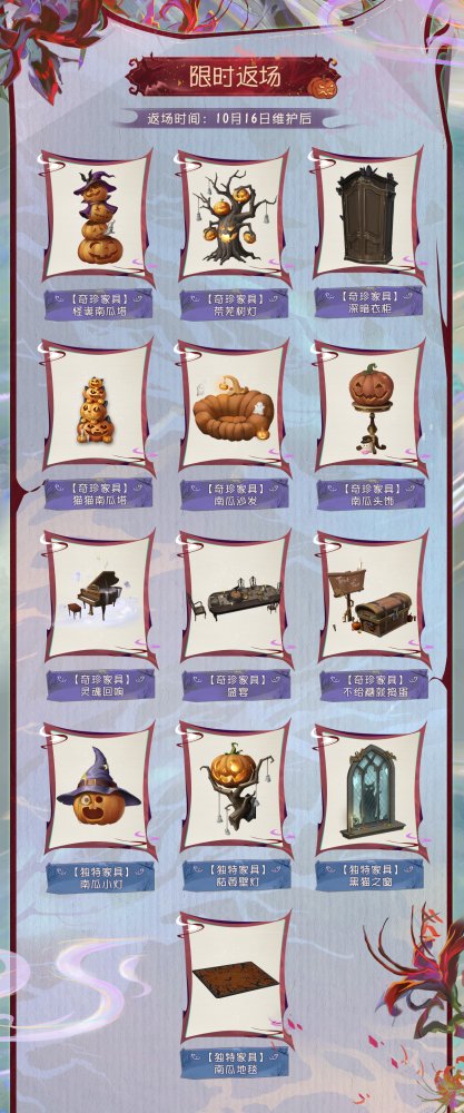 10月16日维护后,往年万圣节主题活动时装、随身物品、个性动作和家具等已返场上线。
