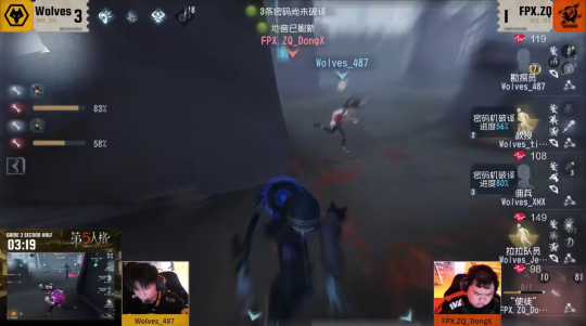 第一天,成都Wolves vs FPX.ZQ第三局下半场来到红教堂,FPX.ZQ_DongX使徒”开局追击小木屋的Wolves_tian教授,Wolves_tian提前拉点转入大房,中场Wolves_Jelly拉拉队员密码机已被干扰,遂见缝插针为教授叠上激励,Wolves_tian利用两次激励加速继续与监管者保持安全身距,在大房长窗区与使徒”进行博弈,期间拉拉队员在旁不断叠激励层数。待Wolves_tian转点入小木屋的时候,激励层数已经成功来到28层,FPX.ZQ_DongX及时使用恫吓使拉拉队员沉默,教授身上的激励层数也在此期间消退,但Wolves_487勘探员机子破译完毕后,如及时雨般火速赶来接力保护教授,队友纷至沓来的帮助对于监管者来说一时间有些应接不暇,见此情景,FPX.ZQ_DongX只好选择换追拉拉队员,被迫闪现开刀。但拉拉队员手中两层鼓舞使监管者很难利用猫步快速跟上,且Wolves_487勘探员还在中场随时待命,用磁铁吸引监管者,成功让Wolves_Jelly拉拉队员翻窗再次转点进入小木屋。待使徒”的爱猫咬住拉拉队员即将被眩晕的时候,Wolves_487眼疾手快抛出磁铁,弹开监管者;在监管者追击拉拉队员的必经之路上截辕杜辔,利用磁控法则将使徒”远程拉回并造成眩晕,功成身退后去破译最后一台密码机,将战场留给拉拉队员和即将救援的佣兵发挥。FPX.ZQ_DongX挂上拉拉队员后,选择直接去管控密码机,同时放手一搏赌勘探员没有携带回光返照以此来作为开门战的切入点,但一切都按照求生者方的节奏忙不迭地进行着,Wolves_XMX顺利将勘探员救下并在规避闪现之后快速使用护臂拉开距离奔向小门。整个对局成都Wolves求生者群策群力,一狼呼群狼至,完成一场畅快的四跑!