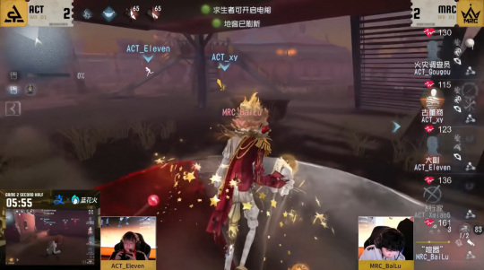 MRC vs ACT第二局下半场,在月亮河公园ACT_Xmiao5飞行家在终点站合理使用飞行器围绕两板一窗和站台双板稳健牵制,并及时砸板延长自己的牵制时间。ACT_Eleven大副利用海神怀表周旋于狂欢之椅附近,最大化利用了飞行家的淘汰时间,无伤将人救下。MRC_BaiLu再次挂上飞行家后,利用通缉隔墙使用分身将大副状态打下并将最后的海神怀表逼出,使求生者被迫卖掉飞行家。MRC_BaiLu趁热打铁,直接利用移形去管控三站下密码机,但ACT_xy古董商还是先一步把密码机抢亮。面对满道具的古董商起追击节奏较为低效,MRC_BaiLu选择继续去追击半状态没道具的大副。眼看大副能被挂回遗产机,ACT_xy古董商先在外围重启密码机,ACT_Gougou火灾调查员准备进行救援并在人皇桥上破译遗产机给压力,MRC_BaiLu放下大副前去压制火灾调查员,古董商也及时参与到战场中来,三人围绕最后一台大遗产机进行拉扯。最终人皇桥上密码机压好,古董商将人救下进入开门战阶段。喧嚣”利用焰火舞台封锁古董商技能,分身双球触发伤害快速击倒古董商,ACT_Eleven大副预判监管者会移形排查终点站,躲避监管者的锐气,蛰伏在马戏团最深处的角落并不急于救人,极限卡在监管者耳鸣之外,杀监管者心理上的一个回马枪,使其误判大副已经向起点站大门赶去;待监管者排到马戏团附近的时候,大副来到了已经被排查过的小门开始点门,最终成功逃脱达成平局,完成了一场以暗击明以逸待劳,信息差对阵高机动性、心理博弈上的智斗。