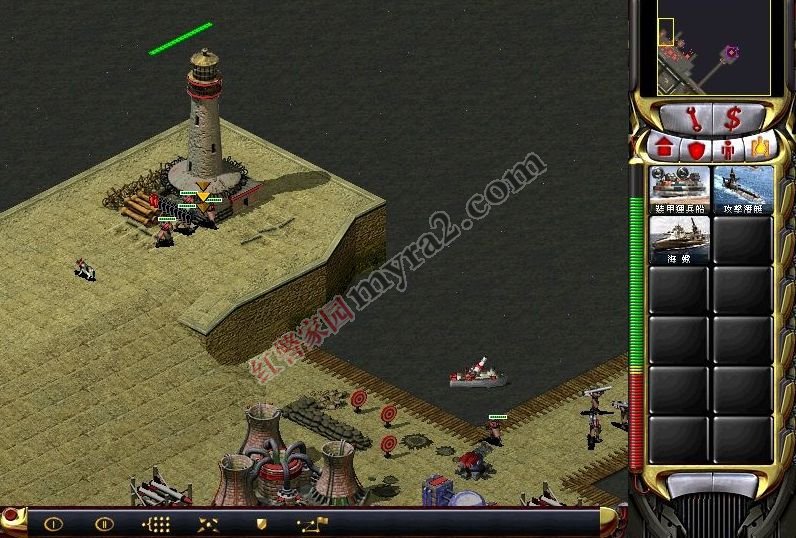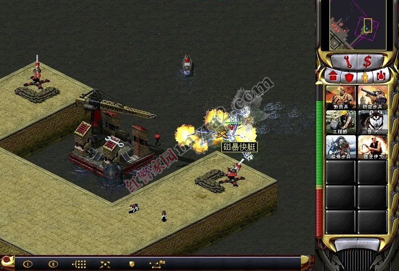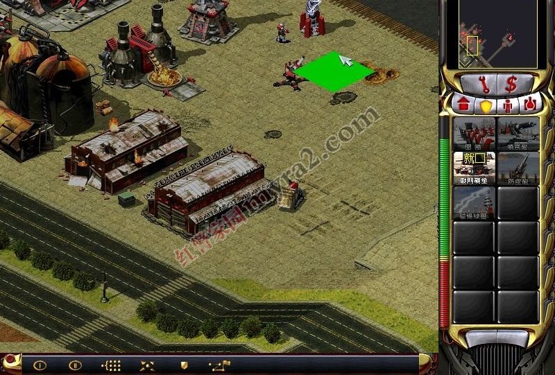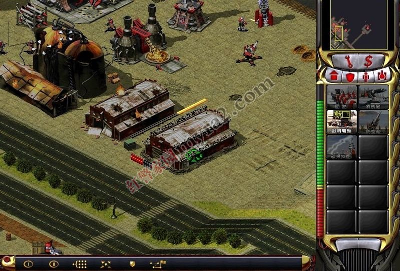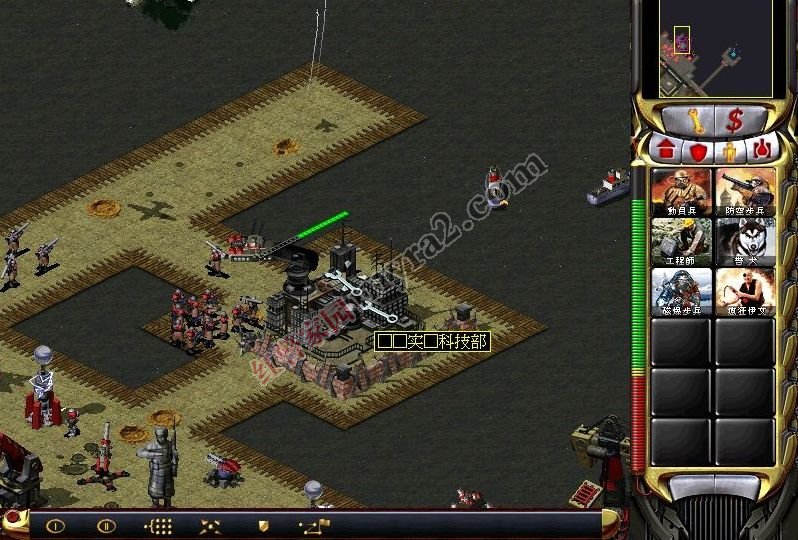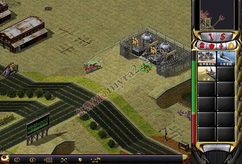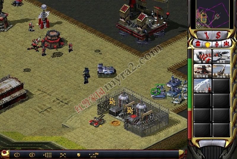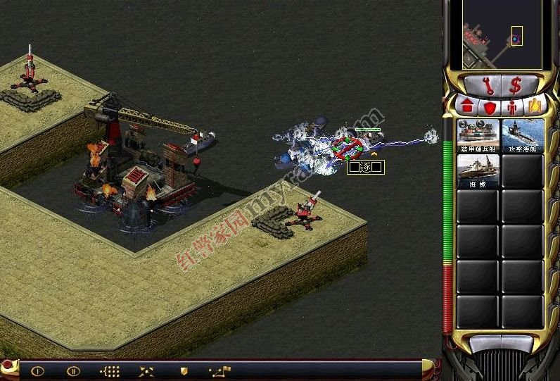 好像我是弄完刚才的所有步骤,才没有游戏结束。才有空派一个天启来这里弄掉铁网。钱只够你暂时生产2个工程师了。先占领一个油井。然后出一个碉堡,进驻5个小兵。敌人的下一波攻击油井这里会有几个光陵坦克。