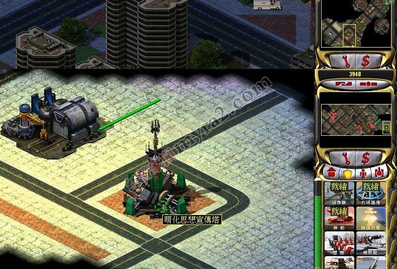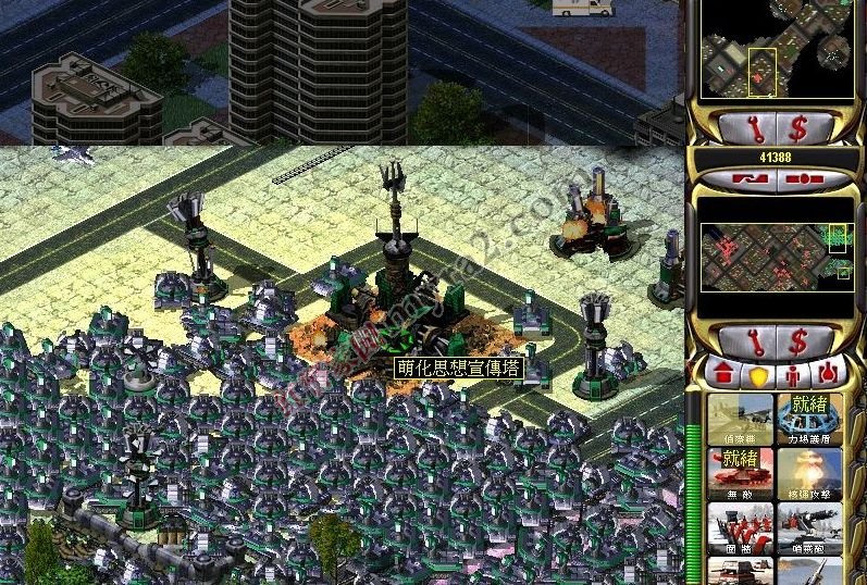 不知道是不是没有设置好攻击。这里堆积了大量的幻影坦克和光陵坦克。没有办法,用核弹丢这个宣传塔。随便会爆掉一些坦克。