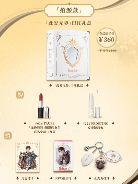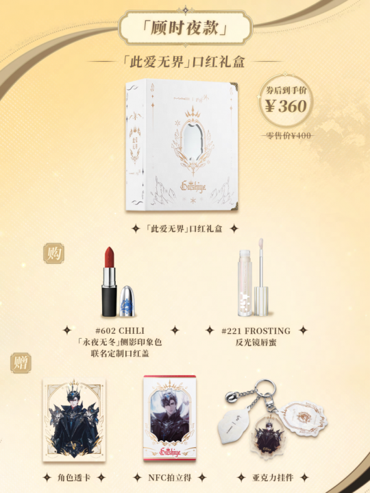 购买?此爱无界?礼盒,可获得?此爱无界?联名侧影印象色、221反光镜唇油、联名周边礼盒(含联名定制口红盖、角色透卡、NFC拍立得、亚克力挂件、品牌大号定制化妆包等丰富周边礼品)。