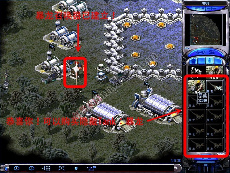 4.暴龙召唤器”建造好了后你就拥有了暴龙的制造权了!5.不要忘了,你占领Tank建筑的工程师还在哦!虽然因为你有了暴龙科技而不允许制造其他Tank了。但是,你别忘了,Tank建筑不只是Tank的生产凭证,他还能给你提供一个超级武器使用权!选择你心爱的超武踏上战场吧,让他们见识一下谁才是真正的王者!最后,尤里的复仇Tank 1.06地图下载地址:http://www.hsjj5.com/xiazai/9210.html