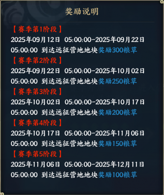 1、远征营地可获得的粮草,与赛季开启的时间阶段挂钩;