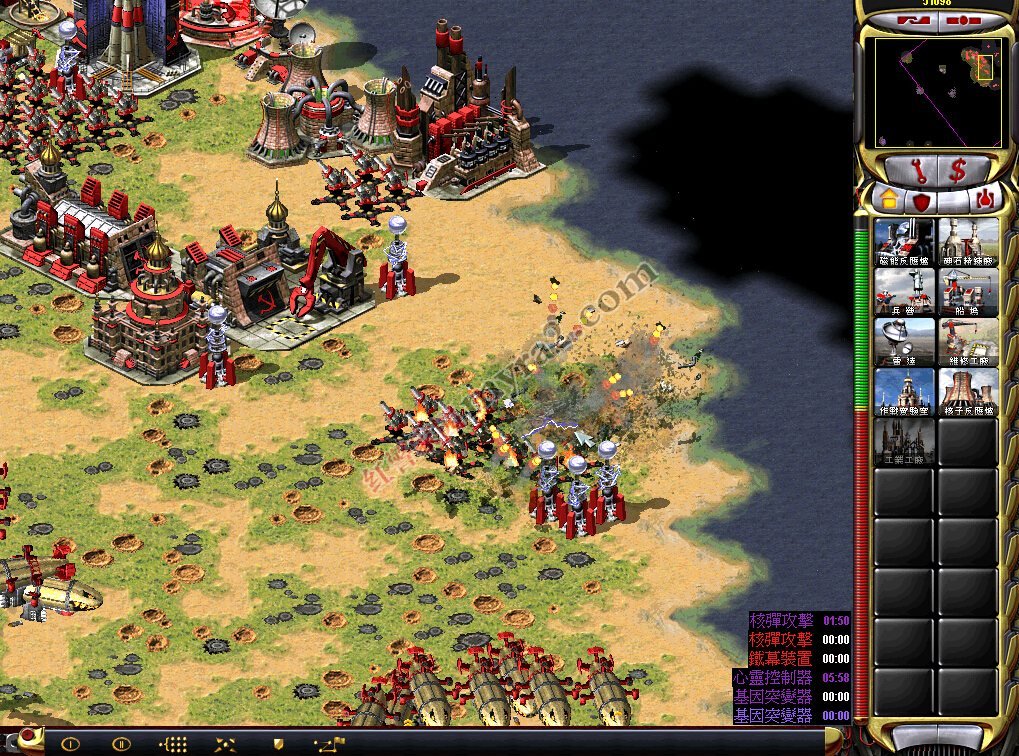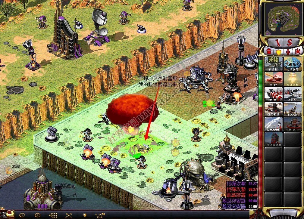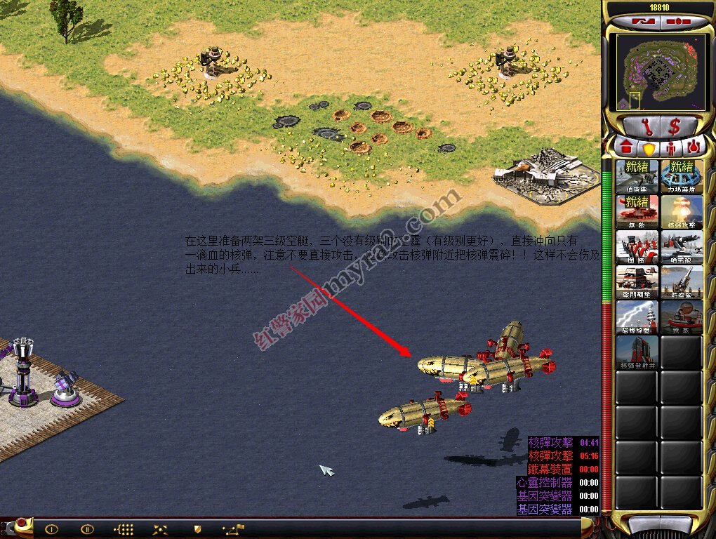 ②炸完那个紫色基地,敌军的核弹和心灵控制器如果再被炸就不能重建了,所以就是反击的时候了!所以第二步就是炸核弹。用情况1里面核弹附近的空艇直接炸掉,这次不用小心别的,炸掉就是。然后炸心灵控制器,附上炸心灵控制器和核弹的图: