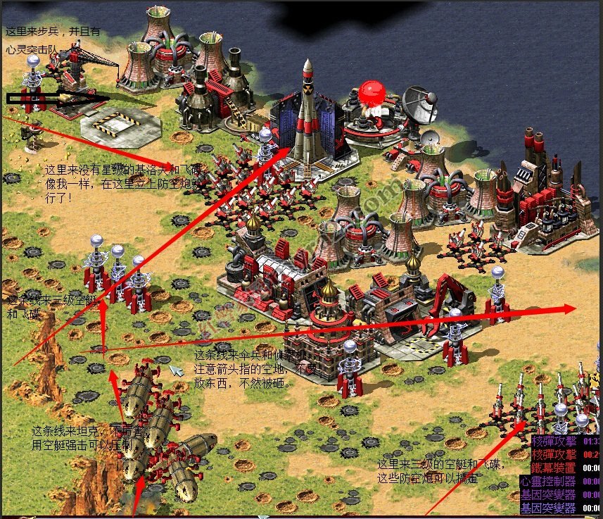 当你发现心灵控制器就快好的时候(还有10秒),派你那几辆没被干死的防空车去地图上方的那条路沿着海岸线快速跑(沿海跑是怕被高处的巨炮光陵塔打到),这样控制不到你,心灵控制过后马上回来继续防空。四:坚守阶段