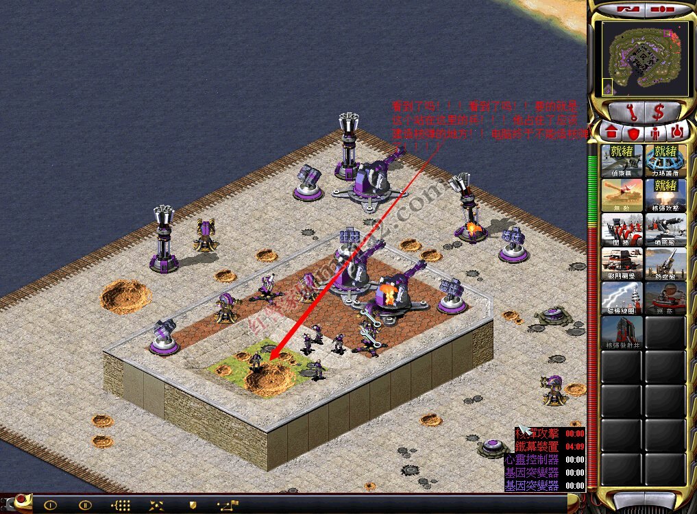 1:如果你炸碎了右下角的核弹,并且从废墟里走出来的小兵站在了本应该建造核弹的地方,阻碍了电脑建造核弹,并且电脑不会把兵移走再建。(炸碎核弹还能保持小兵存在的方法下面图中有)