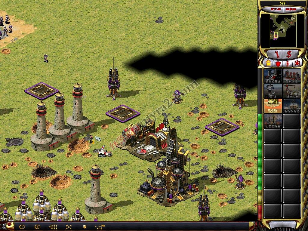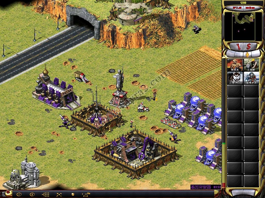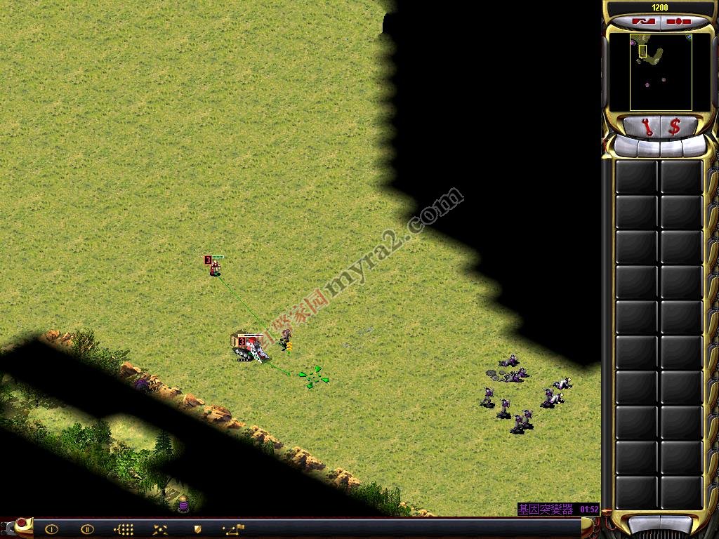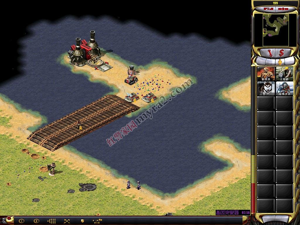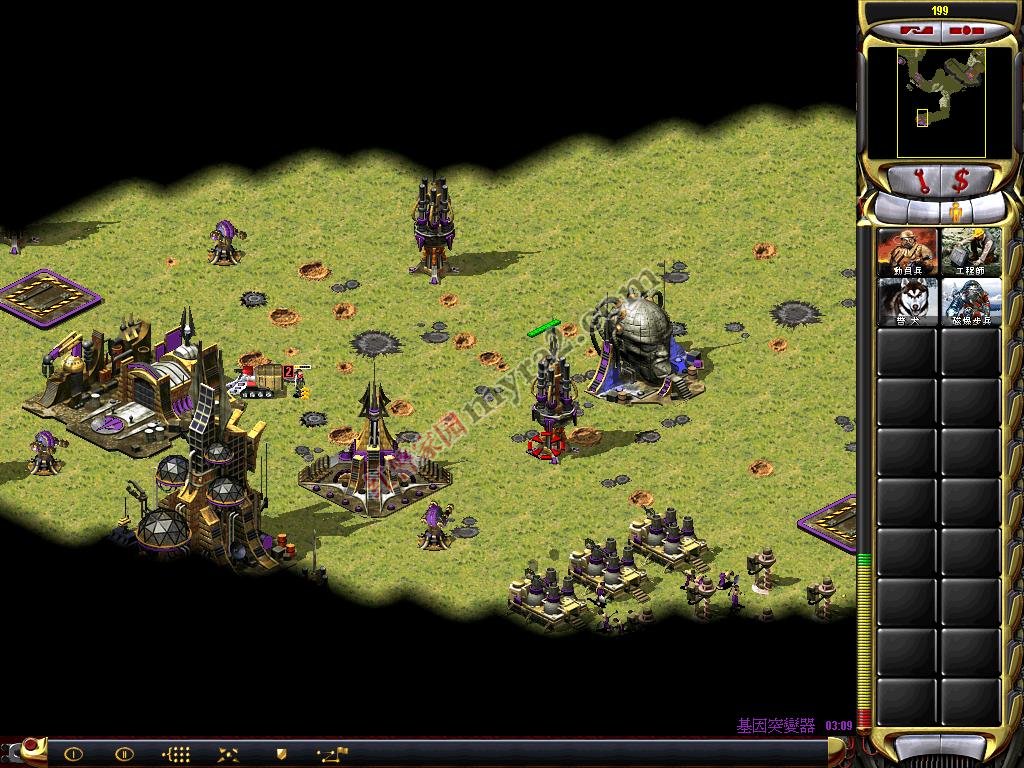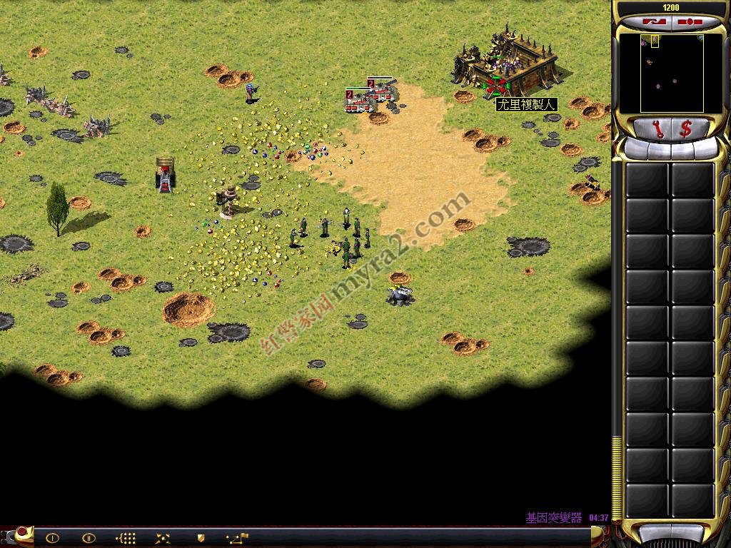 矿车吸引火力,和谭雅杀到尤里基地中央。尤里建造场旁边是个安全岛,谭雅可以随时摧毁基因突变器,这样基因突变的威胁就暂时解除了。