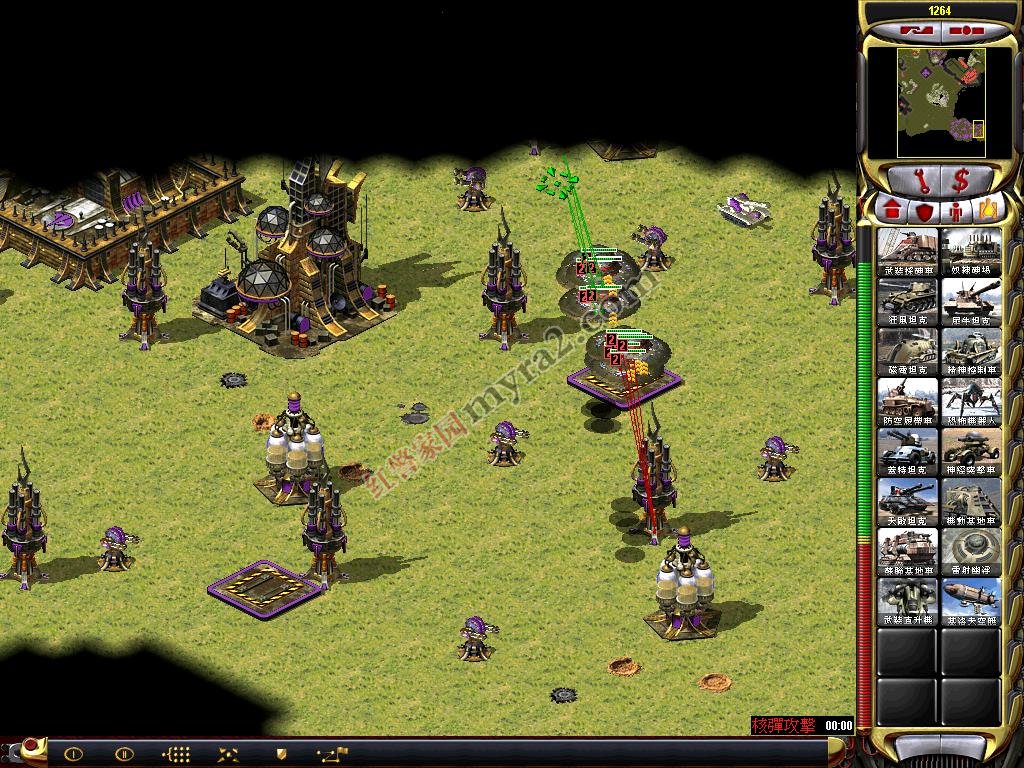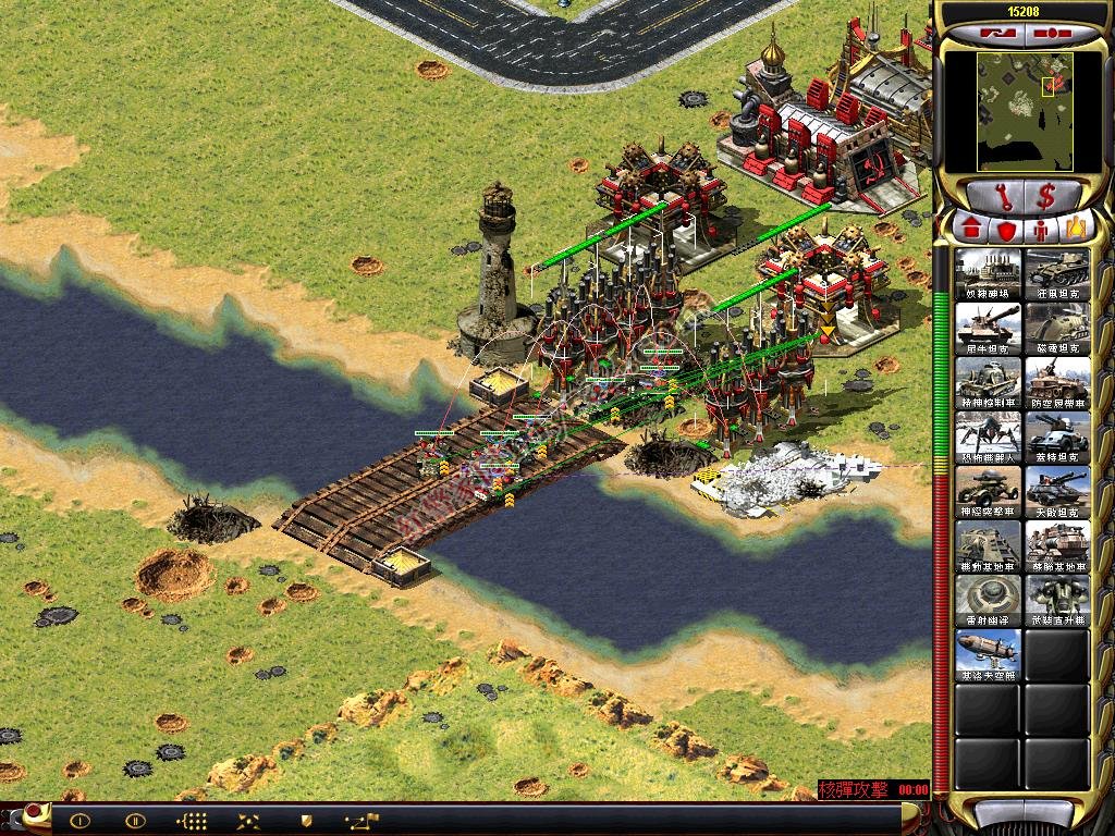 生产工程师占领苏军建造场,可以免费建造灯塔,不但提供电力,还可随处造。在尤里基地里造灯塔吸引火力,谭雅摧毁建筑并造上灯塔防止重建。占领尤里建造场,生产尤里矿车到左上和右中采矿。