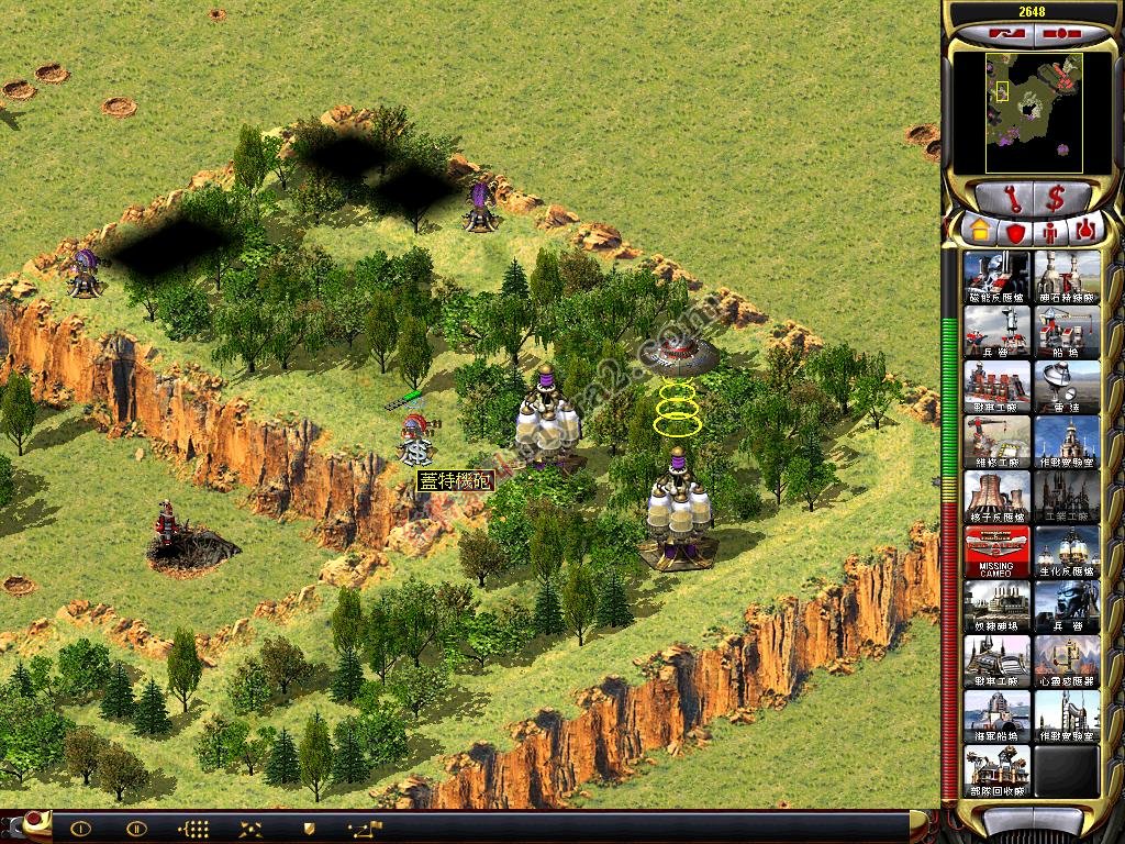 履带车载着工程师和老鲍到左边占领矿场, 然后矿车采矿。老鲍和坦克防守矿区。有了钱马上生产防空履带车,尤里的另一基地生产的飞碟马上杀到。