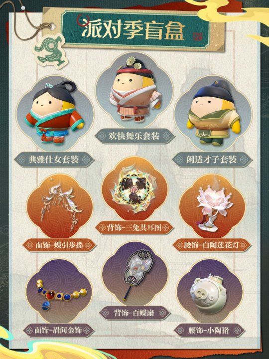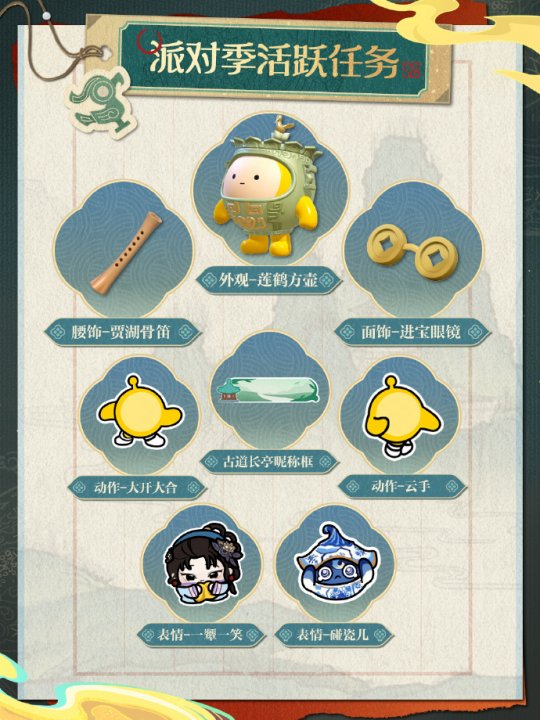 国宝归乡季”派对季活跃活动正式开放!完成全新派对季活跃任务,即可前往兑换商店获取稀有盲盒莲鹤方壶”、稀有配饰贾湖骨笛”、进宝眼镜”,更有派对季限定全新表情一颦一笑”、碰瓷儿”,动作大开大合”、云手”,和古道长亭昵称框”等奖励等待兑换。