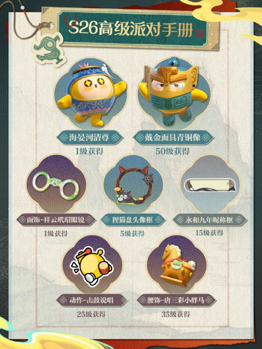 国宝归乡季”派对季的派对手册分为基础版和高级版两部分,相应的奖励各不相同。本季基础派对手册的全部奖励有:800潮流纤维、17500瓶盖、稀有表情大无语”、高级头像框西窗烛头像框”、稀有配饰玉猪龙”、高级装扮卖货郎套装”。