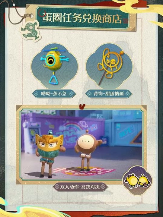 国宝归乡季”派对季盛大开启,蛋仔们可通过蛋圈页面进入蛋圈任务,和蛋圈成员一起组队完成任务,即可兑换呦呦蕉不急”、配饰甜蛋糖画”和双人动作高跷对决”!