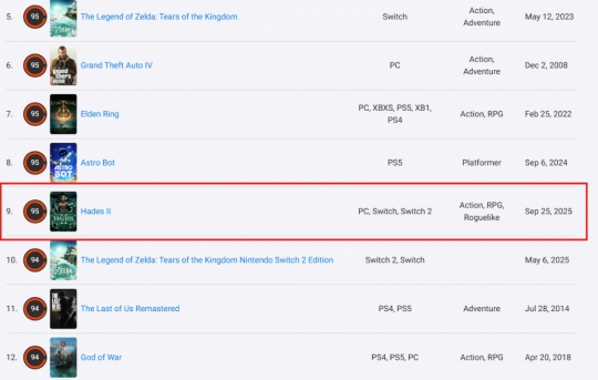 目前,在OpenCritic平台上,仅有《超级马里奥 奥德赛》、《博德之门3》和《塞尔达传说:旷野之息》三款作品的评分在96分及以上,略高于《哈迪斯2》。与其同分(95分)并列前十的则包括《荒野大镖客:救赎2》、《艾尔登法环》、《侠盗猎车手4》等重量级3A大作。此外,在另一家主流评分网站metacritic上,《哈迪斯2》同样保持着95分的媒体均分。