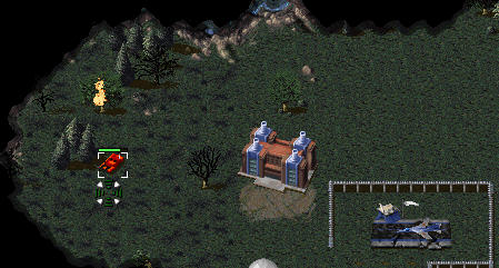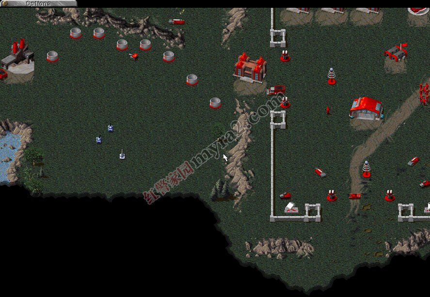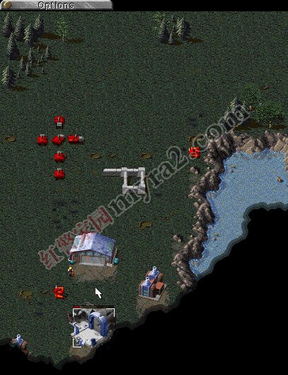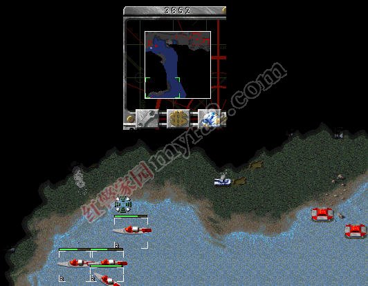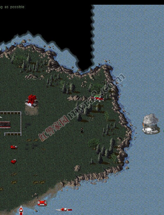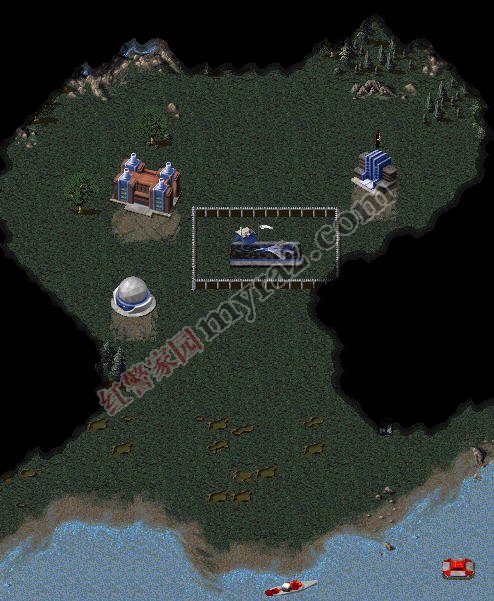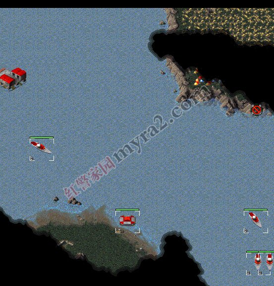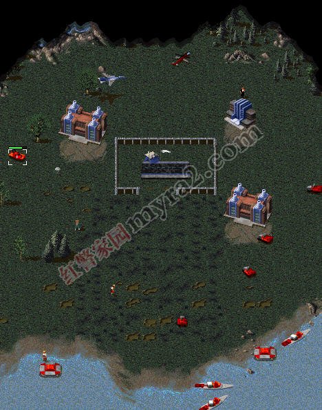 与此同时,左上角开始建造船坞造3-4艘驱逐舰,2艘运输船,搭载4磁暴坦克1重型坦克,和2工兵1间谍准备登陆
