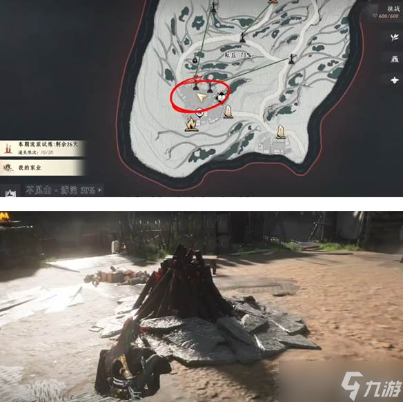 获取到足够的烧饼以后,来到下图的位置,来到篝火边选择取暖就可以烤烧饼了。