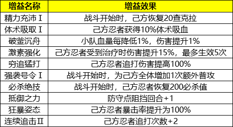 4、该玩法要根据不同的忍者和阵容来选择适配的增益效果,具体需要以自己拥有的忍者为准。