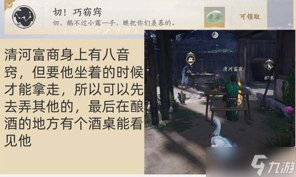 跟随清河富商,等清河富商在酒坊坐下放松警惕时成功偷走八音窍,并且成功放入藏宝点,就可以解锁成就了。