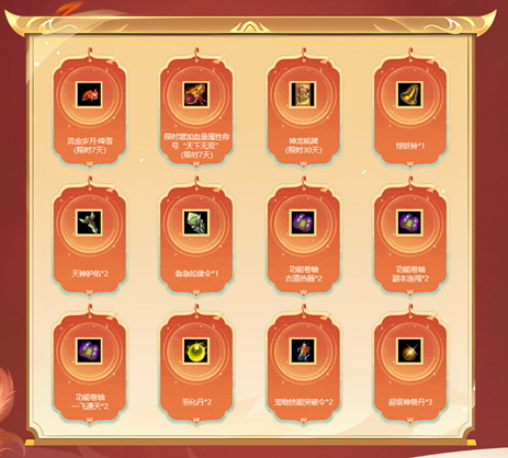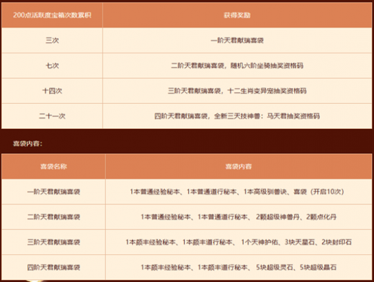 累积开启200点活跃度宝箱次数达到3/7/14/21次的玩家可以前往活动大使处领取对应阶位的“天君献瑞喜袋”奖励。