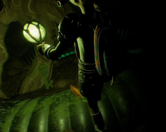 钥匙在出破碎的管道后直走一点就往右下游,能看到很多海藻的地方有个洞,钻进去一直往里走,到有能换气的管道后贴近看就找到了