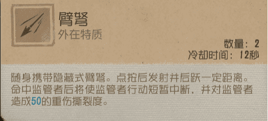 ①弓箭手随身携带三支弓箭,长按蓄力后可以发射,蓄力时会减少10%的移速,命中监管者会短暂中断监管者当前行动使监管者陷入重伤状态,并附加50的撕裂度;