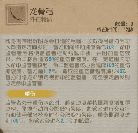 ③重伤状态下监管者正常移动时撕裂度增长较为缓慢,在使用龙骨弓命中监管者后先正常进行牵制,等撕裂度较高时再考虑转点;