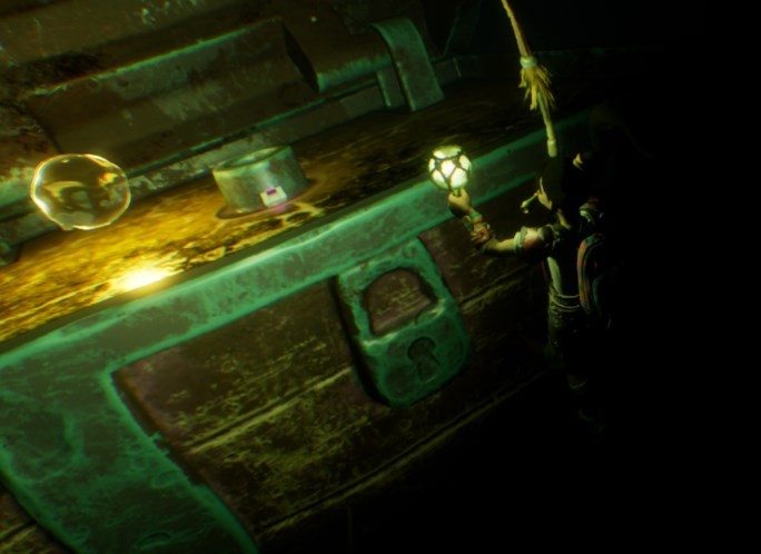 然后再上到野餐桌上,城堡进去后第一个十字路口往左走,到尽头右转继续走,右边看到门进去,直走到尽头雕像后面有门进去,就可以看到箱子了