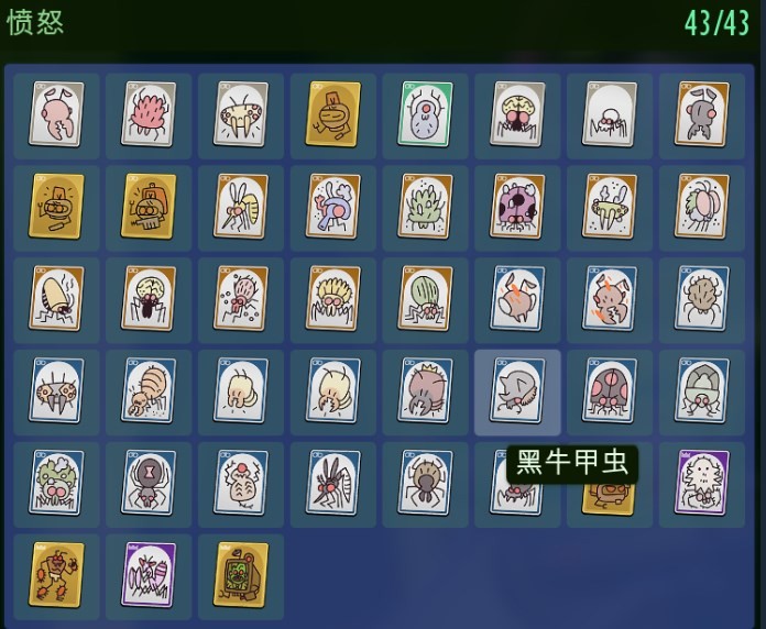 1.红兵蚁 2.草坪螨虫 3.幼虫 4.劣味泰兹 5.水蚤 6.小织球蛛 7.幼蛛 8.黑兵蚁 9.美味泰兹 10.ARC.R 11.蚊子 12.被感染的象鼻虫 13.被感染的螨虫 14.被感染的瓢虫 15.被感染的幼虫 16.被感染的蚋虫 17.椿象 18.织球蛛 19.潜水钟蛛 20.狼蛛 21.投弹甲虫 22.火蚁工蚁 23.火蚁兵蚁 24.尘螨 25.凶猛瓢虫幼虫 26.蚁狮 27.白蚁工蚁 28.白蚁兵蚁 29.白蚁王 30.黑牛甲虫 31.凶猛瓢虫 32.绿椿 33.被感染的狼蛛 34.黑寡妇 35.刺水蚤 36.虎蚊 37.蜱 38.黑寡妇(小) 39.助理经理 40.育母蜘蛛 41.人蚁 42.兰花螳螂肉串 43.施密克主管