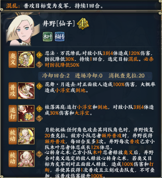 被动Ⅰ:月轮祝福:任何角色攻击其同队角色时,井野恢复20查克拉。敌方小队忍者额外普攻时,井野获得额外普攻,每回合至多3次。井野每次普攻己方小队木叶忍者体忍成长12%体忍。